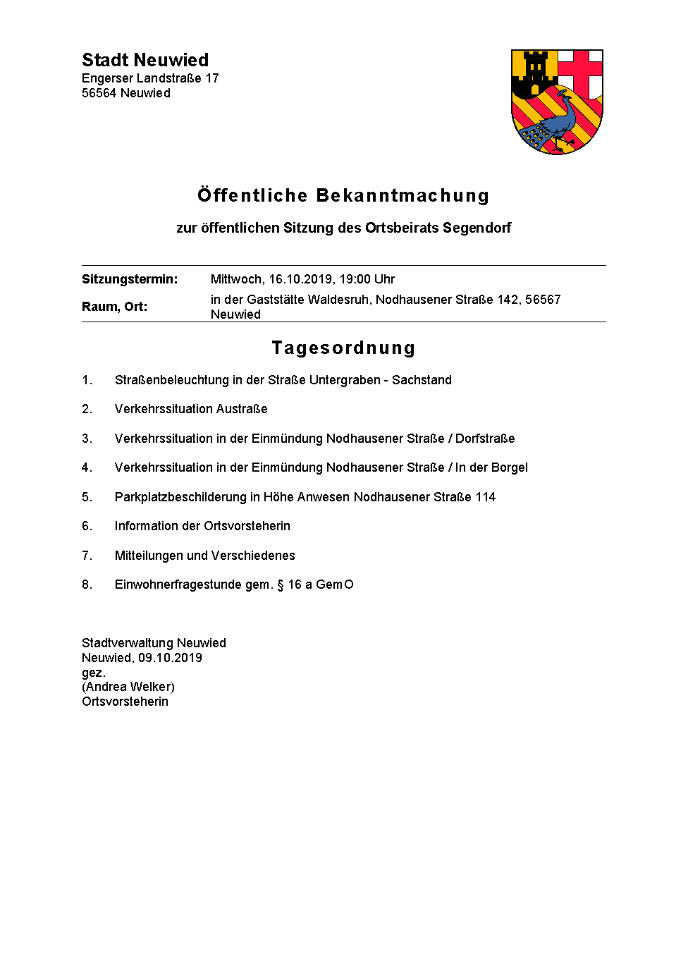 Aktuelles Ortsbeiratssitzung am 16.10.19 Dienstag, 15. Oktober 2019 M.C. Sitzungstermin: Mittwoch, 16.10.2019, 19:00 UhrRaum, Ort: in der Gaststätte Waldesruh, Nodhausener Straße 142, 56567 Neuwied 1