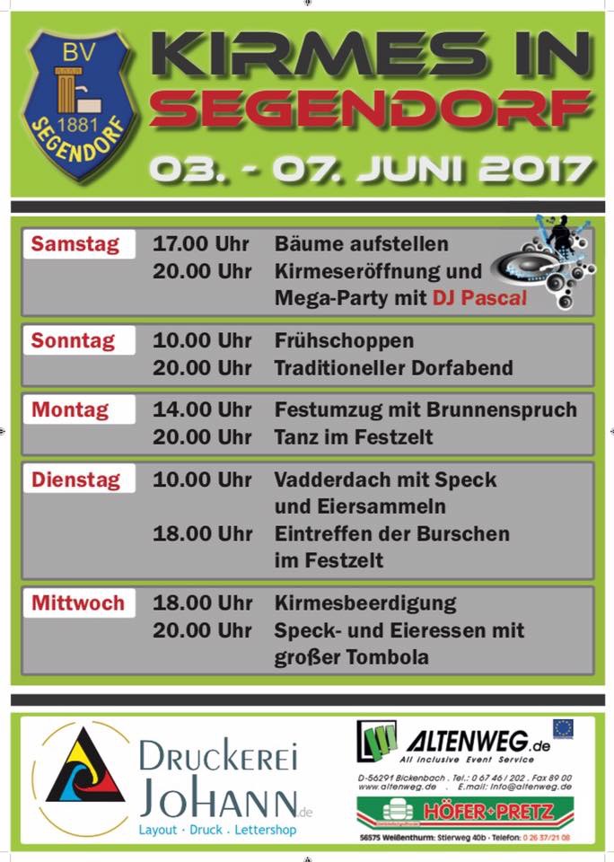 BV 1881 Segendorf Segendorfer Pfingstkirmes 2017 Mittwoch, 24. Mai 2017 M.C. Das Maikönigspaar sowie die Burschen und Maimädchen aus Segendorf laden vom 03.0617 bis zum 07.06.17 zur traditionellen Pfingstkirmes ein. 3